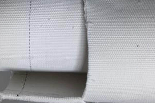 3、安裝新的透氣層:將透氣層鋪在斜槽上并將一端及側(cè)面對齊→在端板上抹上硅酮膠→蓋上端壓板→用氣割燒紅的8mm鋼筋對透氣層打孔→用螺栓將此端固定→另一端用夾板及手動葫蘆將透氣層拉直并固定→裝上殼體密封膠及膠墊→用燒紅的鋼筋鉆兩邊的孔→-裝配螺栓并擰;